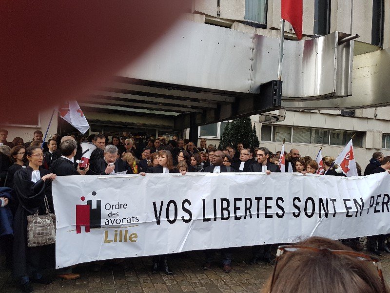 jean Luc WABANT prend la parole lors de la manifestation des magistrats, des greffiers et des avocats devant le palais de justice de Lille. Il condamne les réformes qui visent à éloigner le justiciable de la justice pour masquer le manque de moyens